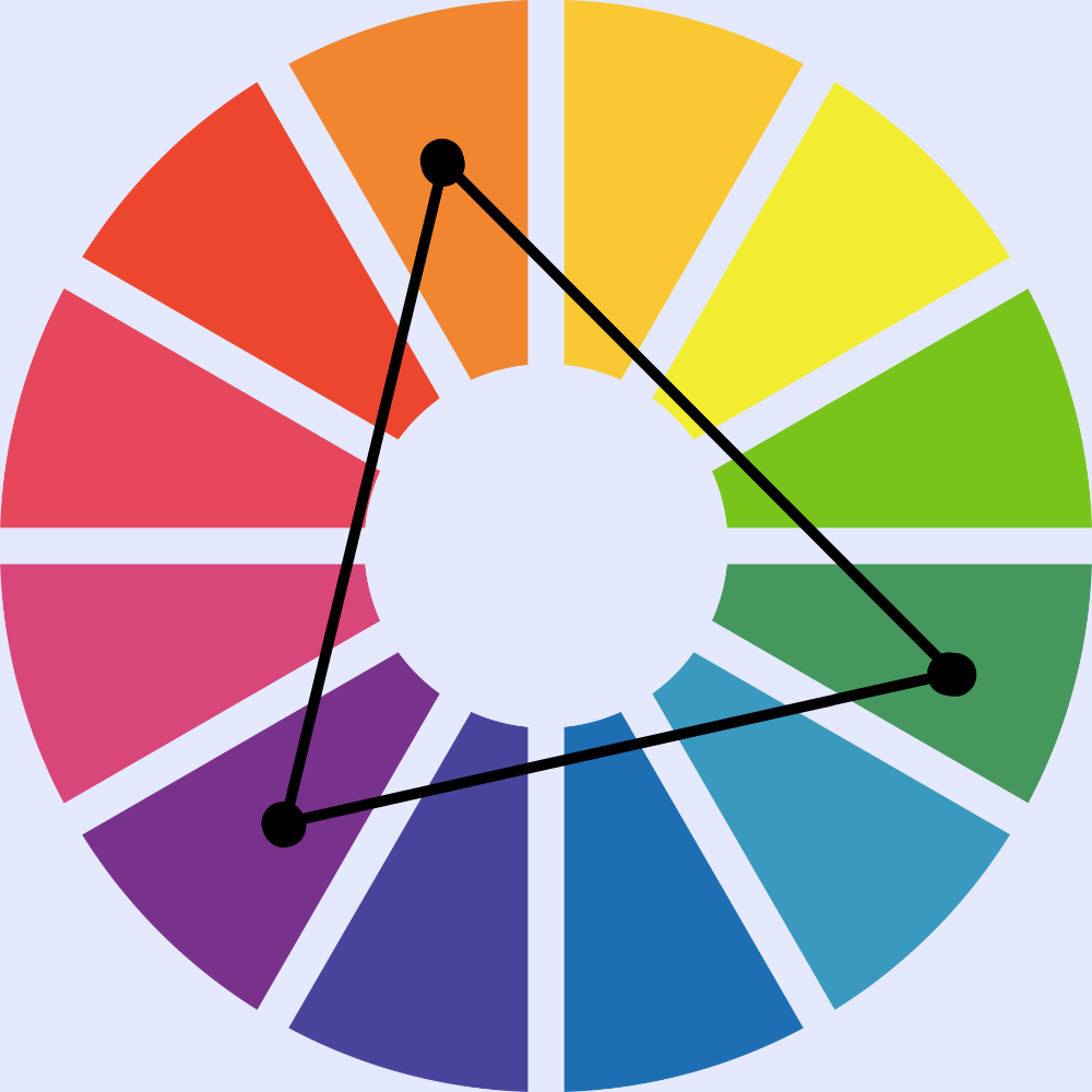 This method involves using 3 colours from opposite ends of the spectrum. This creates a vibrant, eye-catching combination that is great for drawing attention to designs.